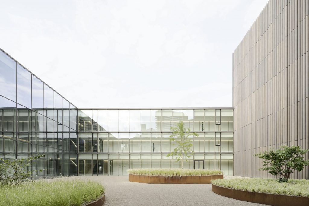 Die Außenanlagen untermalen mit ihrem Vorplatz und den zwei verschiedenen Innenhöfen den erhabenen Archivbau. Während der größere Innenhof an das Eingangsfoyer anschließt und seine Pflanzungen inszeniert, hält sich der kleinere Innenhof durch Akzentuierungen zurück.