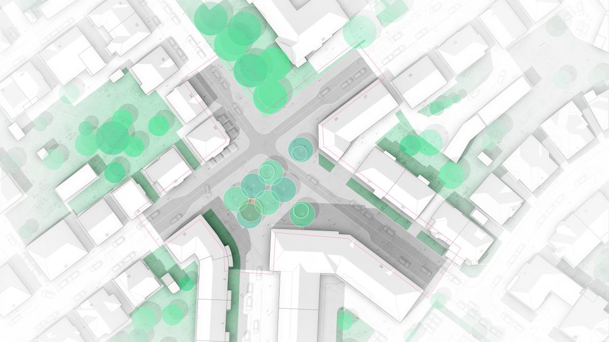 Die umliegenden Fahrgassen werden verschmälert und auf Platzniveau gehoben. So erkennt jede*r Verkehrsteilnehmer*in, dass hier ein urbaner Lebensort ist. Die so gewonnenen Freiräume an den Rändern des Platzes und auf dem mittleren Baumhainbereich vergrößern sich für Aufenthalt und qualitätvollen Stadtraum.