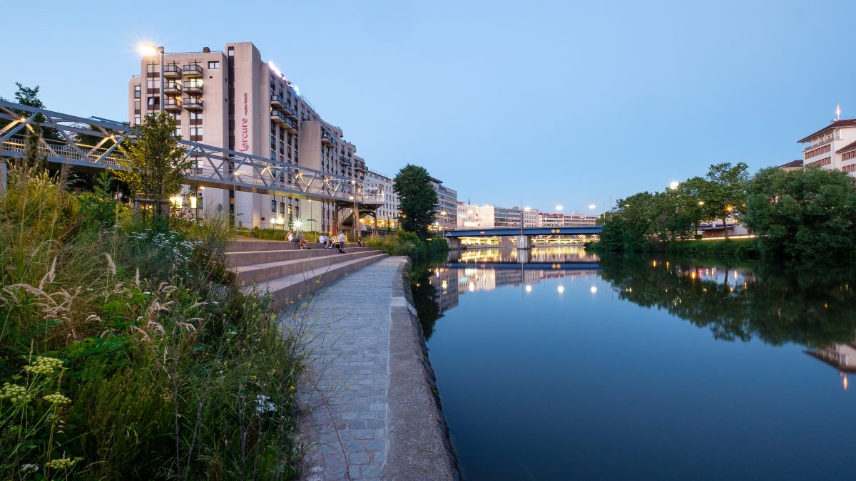 Unterhalb des Stegs wurde die Ufervegetation gelichtet. Hier entstand eine ca. 40 Meter lange Sitzstufenanlage aus Ortbeton, die einen direkten Zugang zur Saar ermöglicht. Entlang des Ufers wurde die Promenade als barrierefreie Verbindung für Fuß- und Fahrradverkehr ausgebaut. Gebäudeseitig wird die Promenade durch Garagen und Andienungsbereiche begrenzt.