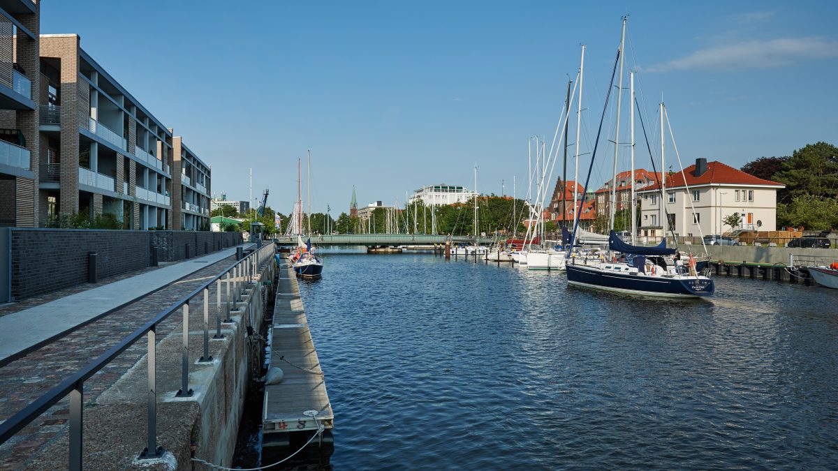 Hochwertige Beläge, Möblierungs- und Beleuchtungselemente bieten das attraktive Umfeld für weitere Investitionsentscheidungen. Wege verbinden die öffentlichen Freiflächen auf den sanierten Kajen im Stadtteil Geestemünde. Das Bild der Oberflächen wird geprägt durch glatte Betonplatten in der Hauptbewegungszone, raues Altpflaster entlang der Kajen und zwischen Plattenstreifen und Bebauung. Die zentrale Wegeachse weitet sich bei Richtungswechsel zu Plätzen mit Bäumen und langen Ruhebänken auf.