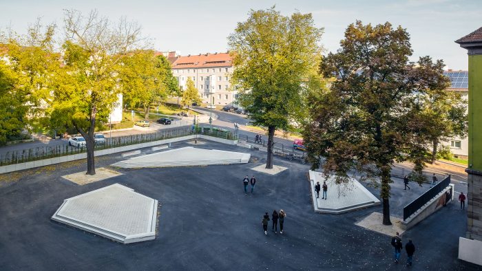 Als städtebauliche Geste wird der Haupteingang an die Michael-Ende-Straße gelegt und so zum großzügigen Quartiersplatz in dem dicht bebauten Wohngebiet: Ein öffentlicher Raum mit repräsentativem Entrée, schattenspendenden Bäumen und Sitzgelegenheiten. Der große baumbestandene Pausenhof auf der Rückseite nutzt den angrenzenden Park als optische Erweiterung.
